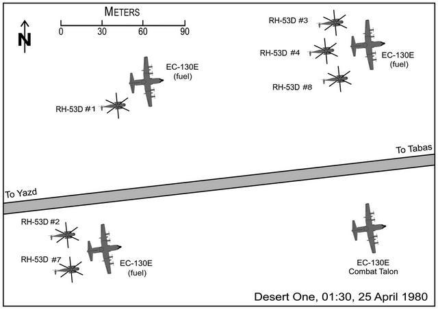 另一路是8架RH-53D直升机,从尼米兹号航母起飞,要在黑暗中穿越数百公里的伊朗沙漠,飞抵同一地点与地面部队会合。然而,就在飞行途中,一架因机械故障折返,两架遭遇沙尘暴后导航系统失灵,在沙漠中迷失方向后才重新起飞,迟到长达90分钟。好不容易到了集结点,其中一架又被发现存在严重液压故障,不得不放弃。8架变5架,这个时候,任务已经行不通了,因为直升机数量低于任务最低可行数量。