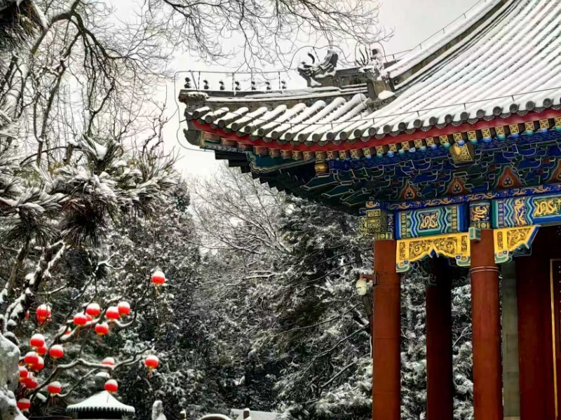 昨夜的降雪让颐和园多了几分温润诗意。仁寿殿的飞檐翘角覆上薄雪,蓝绿彩绘在素白底色中愈发鲜亮。昆明湖畔,松柏枝头挂满蓬松的雪团,不少游客手持相机,在雪地里定格“红墙白雪”的瞬间。