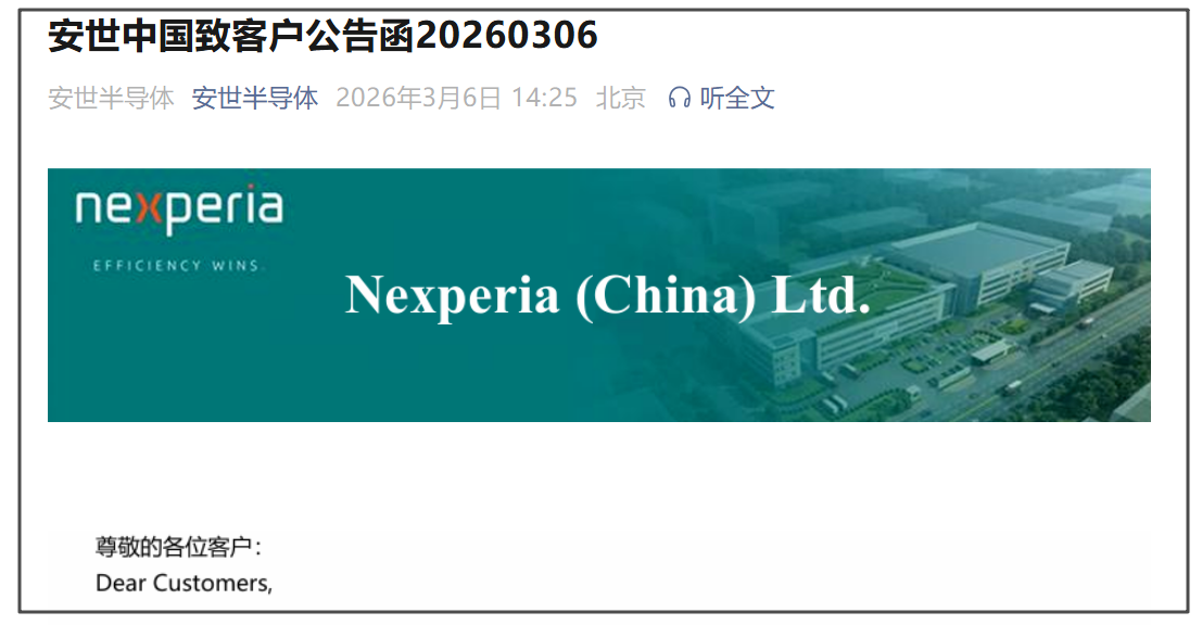 3月6日,安世中国发布致客户公告函: