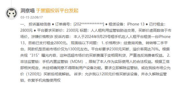 记者注意到,涉及人人租的主要投诉集中在:恶意扣费、“高利贷”式收费、暴力催收、远程锁机、售后难、商品质量问题等。其中,有网友投诉称,在人人租平台上租用iPhone 13,已付租金2800元,还被平台要求支付2300元买断费,总支出5100元远超同期新机价格,据该网友反馈,该机型在二手平台上的市场价仅为1300元,平台要求的“买断费”溢价率高达76%,因此该网友认为,这种远超市场价的买断费属于变相高利贷,严重违反消费者权益。